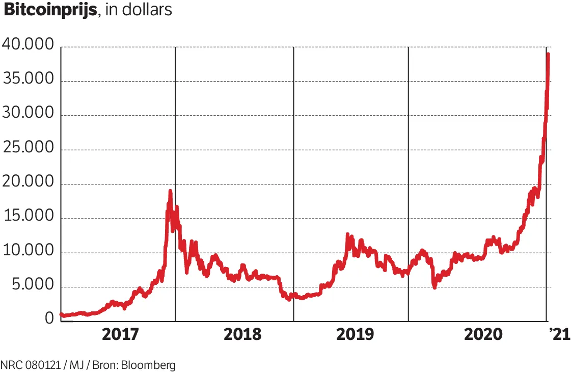 Half december: 20.000 dollar. Rond de jaarwisseling: 30.000 dollar. Cryptomunt bitcoin heeft in een paar weken record na record gebroken. Donderdag noteerde de munt zelfs even boven de 40.000 dollar (bijna 32.600 euro), om daarna weer iets in te zakken. In een jaar tijd is de bekendste cryptomunt van de wereld hiermee meer dan verdriedubbeld in waarde.